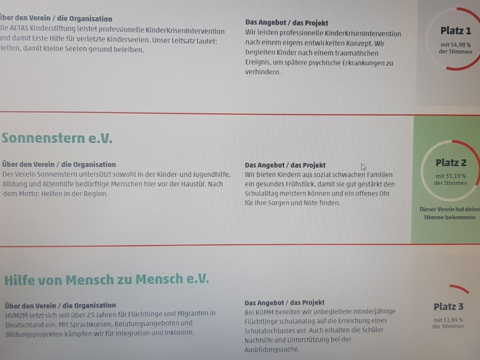 Auch wenn wir es nicht auf den ersten Platz geschafft haben, waren wir trotzdem stolz, bei der Aktion Förderpenny überhaupt in die engere Wahl gekommen zu sein und somit in unserer Region zu den drei aufgestellten Vereinen gezählt zu haben. Immerhin kamen wir beim Voting auf den zweiten Platz und erhielten über 2.200 Euro für unser Projekt "Sonnenstern macht satt". Vielen Dank an alle, die für uns gestimmt haben.