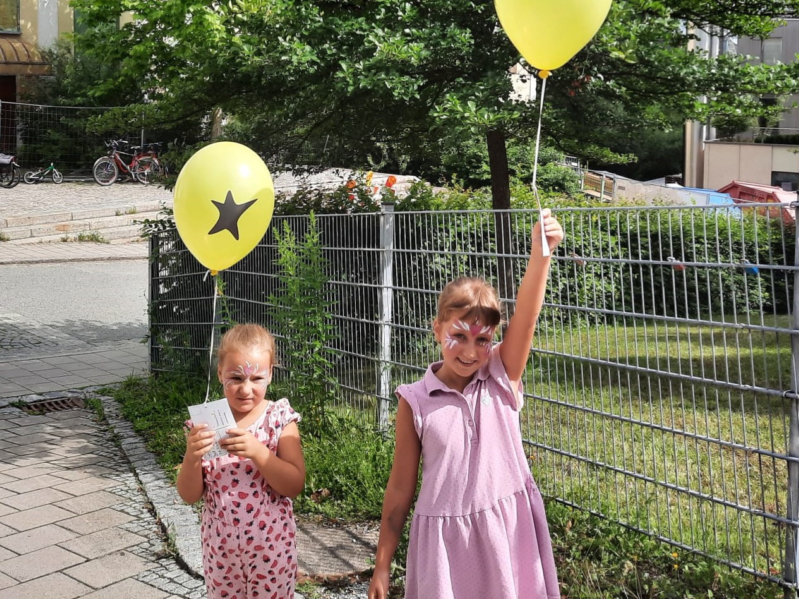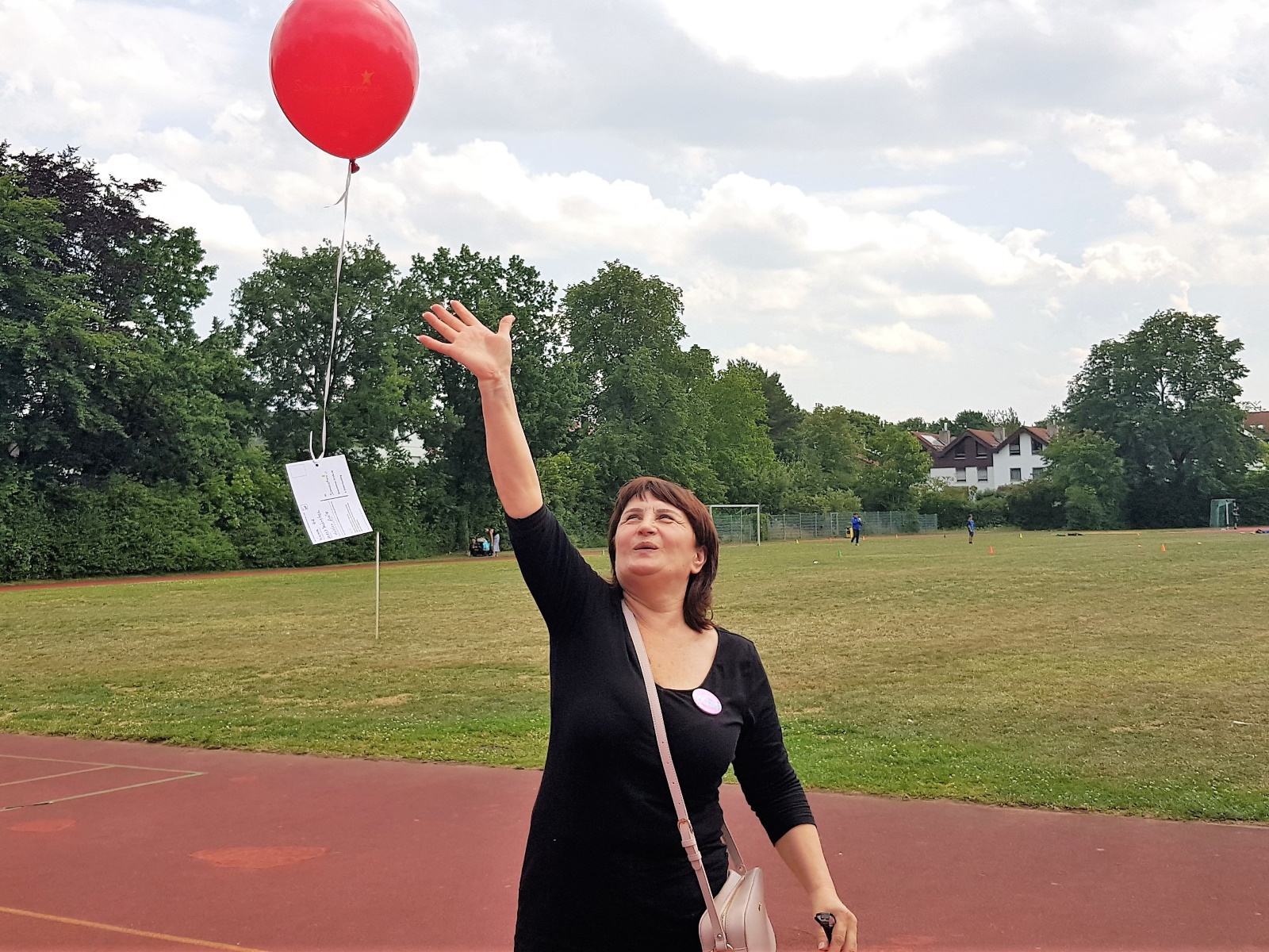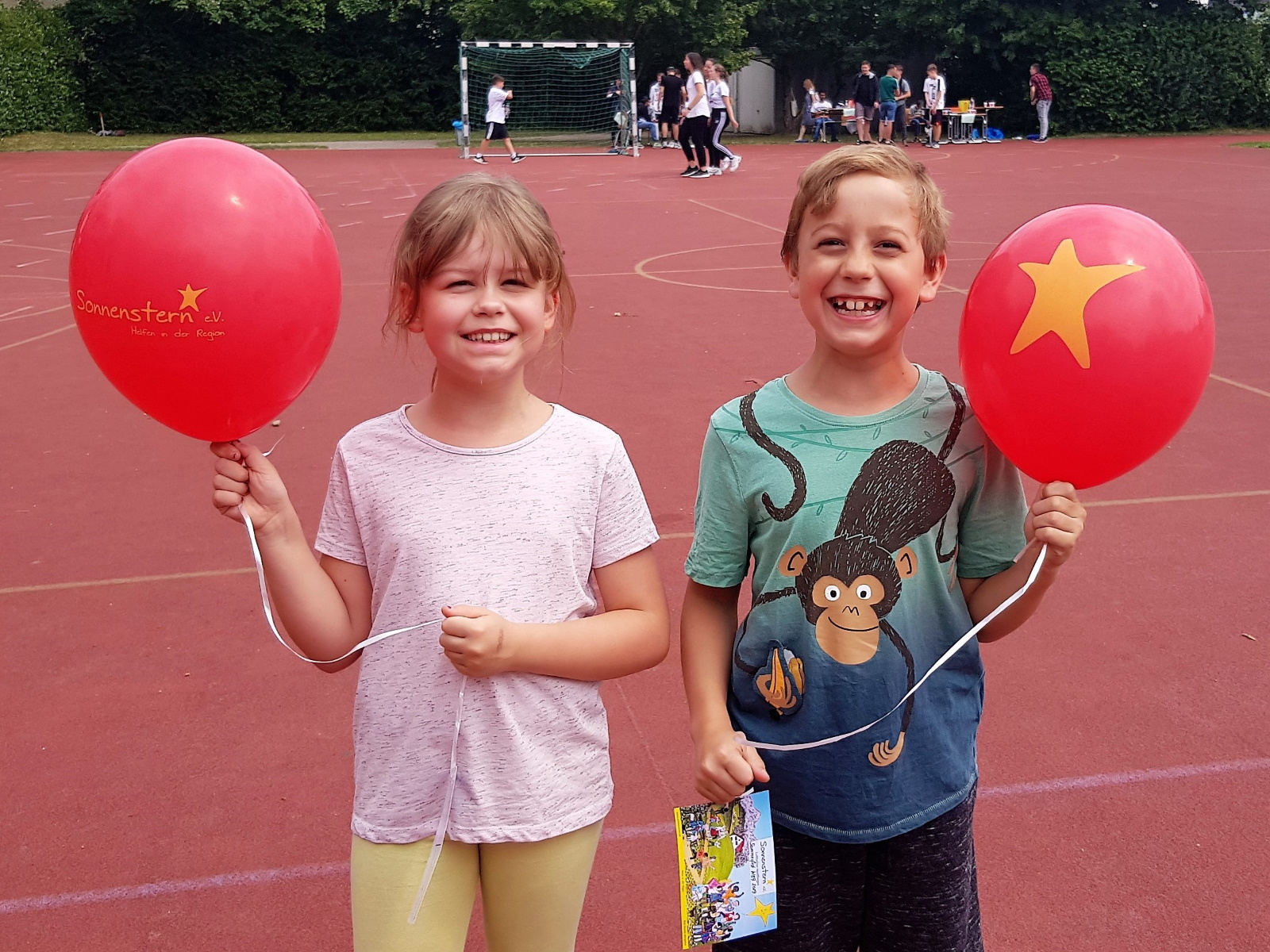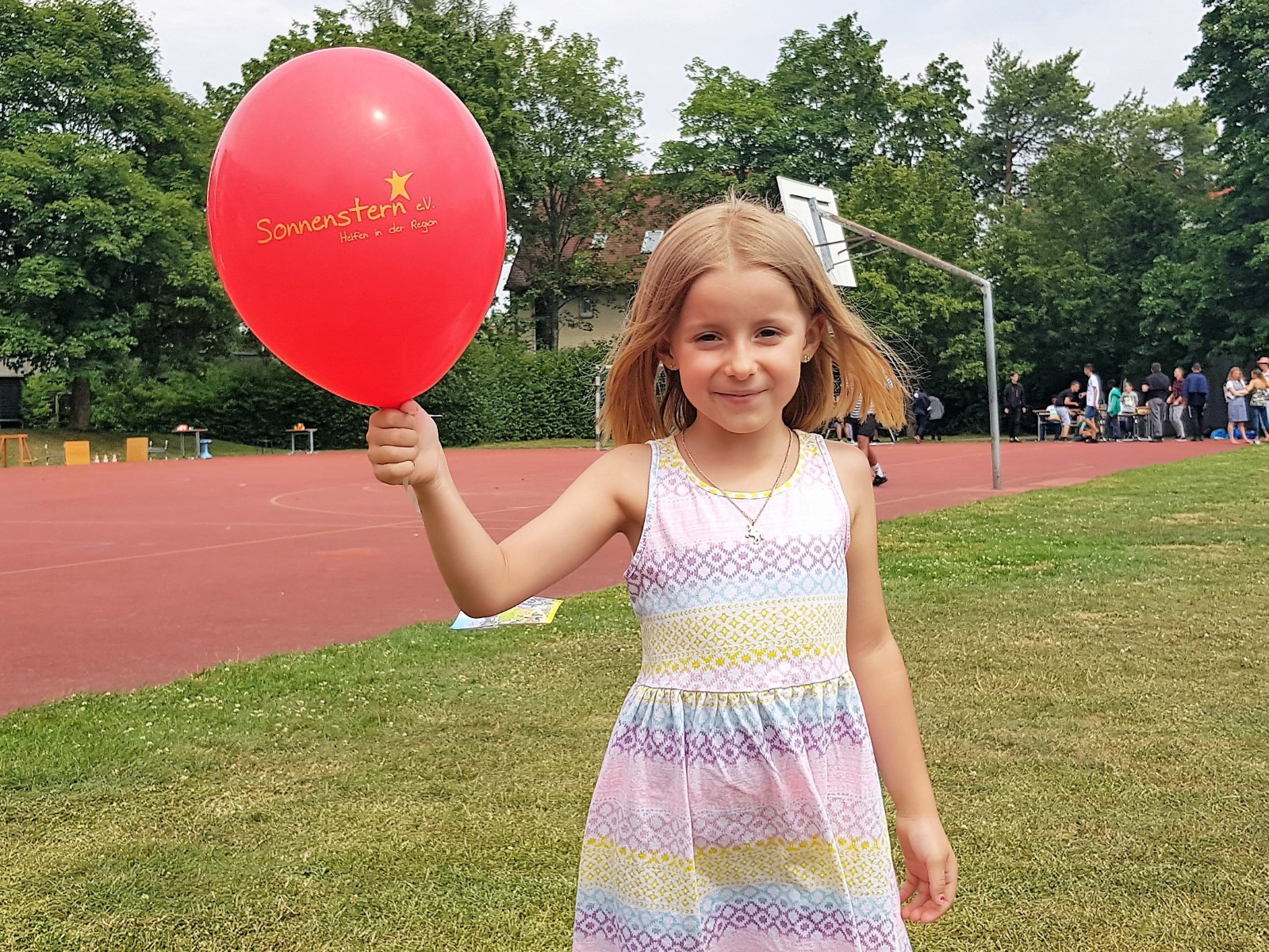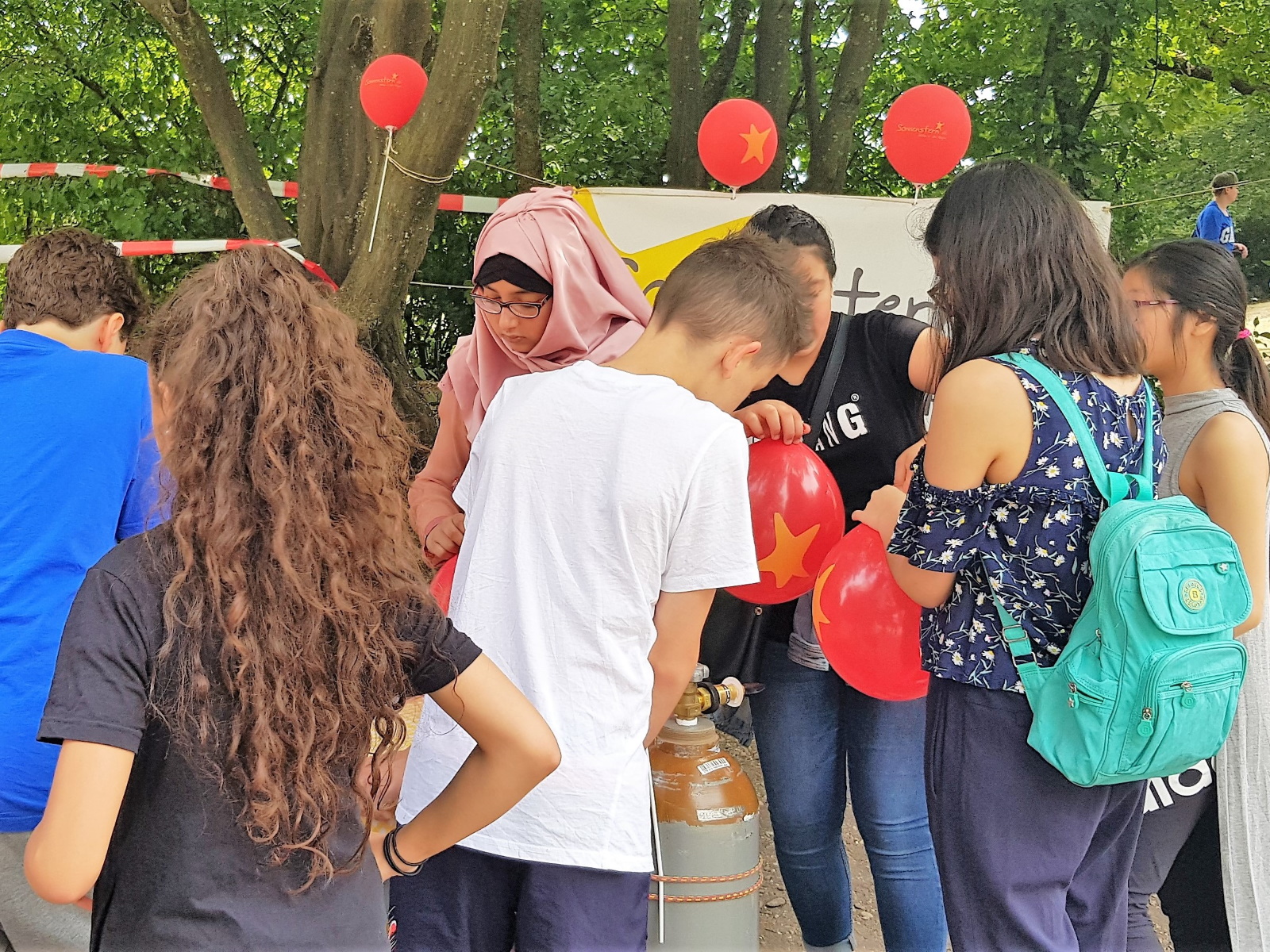 Sommer, Sonne, Luftballon hieß es auch beim Sommerfest der Willy-Brand-Gesamtschule. Da wir die Schule ja schon viele Jahre im Rahmen unseres Projekts "Sonnenstern macht satt" mit unserem Schulfrühstück unterstützen, folgten wir der Einladung gerne und veranstalteten unseren Luftballonweitflugwettbewerb. Unterstützt wurden wir von vier Schülerinnen, die uns fleißig beim Befüllen und Beschriften der 120 Luftballons halfen. Der Umwelt zuliebe gehen beim Sonnenstern jetzt übrigens Luftballons aus Maisstärke auf die Reise.