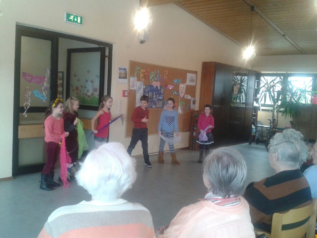 Bei ihrer dritten Aufführung stellten die Kinder mit Sketchen ihre Talente wie Hip-Hop-Tanzen, Eiskunstlaufen und Bodenturnen vor. Mit den dazu passenden Liedern wurden die Heimbewohner dazu animiert, die Bewegungen mitzumachen. Im anschließenden Gespräch mit den Senioren, lauschten die Kinder mit großen Augen den Geschichten von früher.